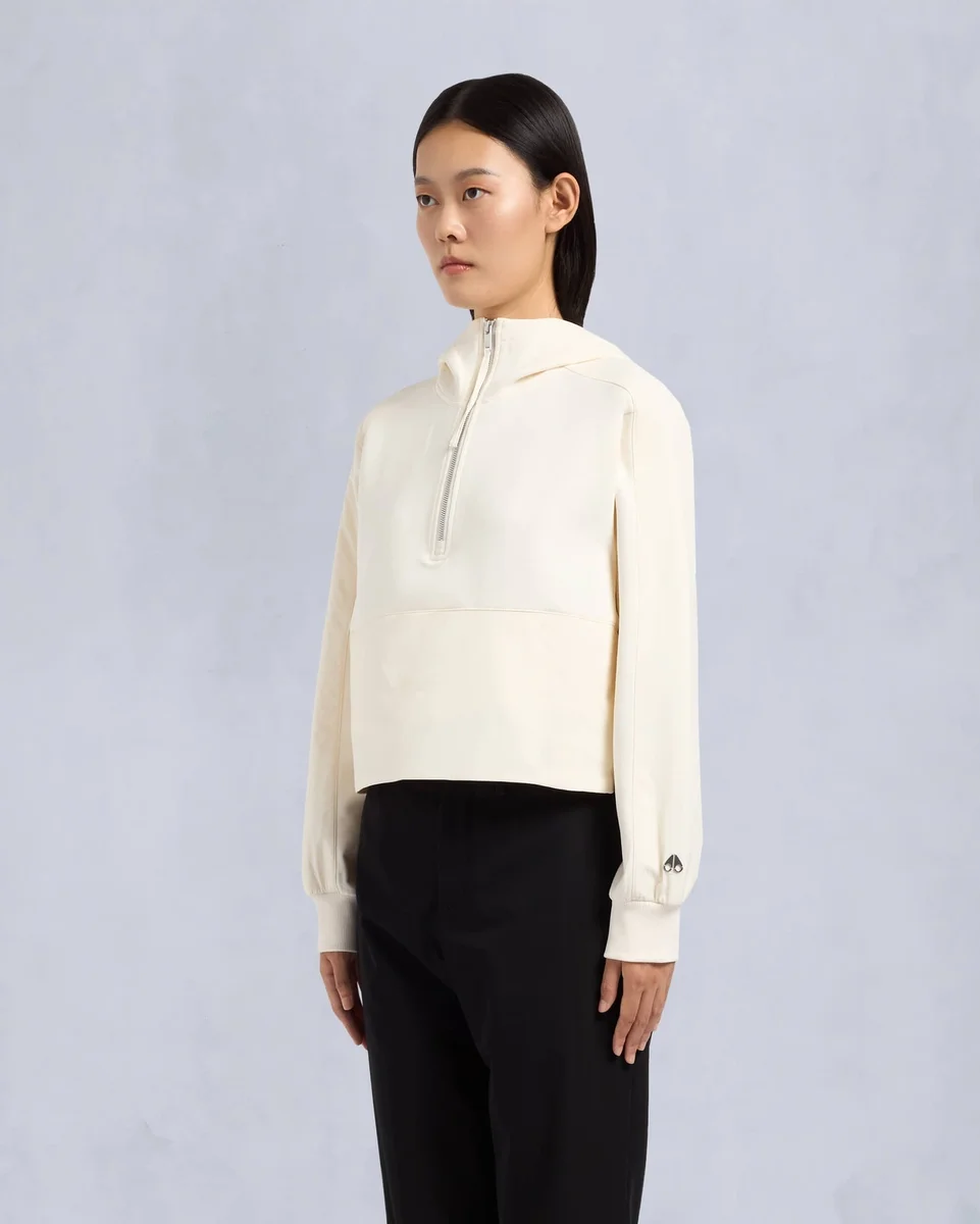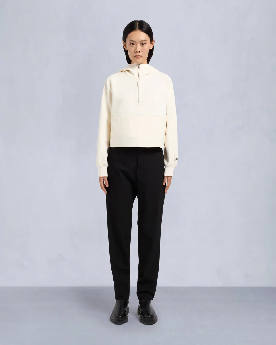 - Apertura con cerniera sulle cuciture laterali e cintura interna e polsini in maglia a costine