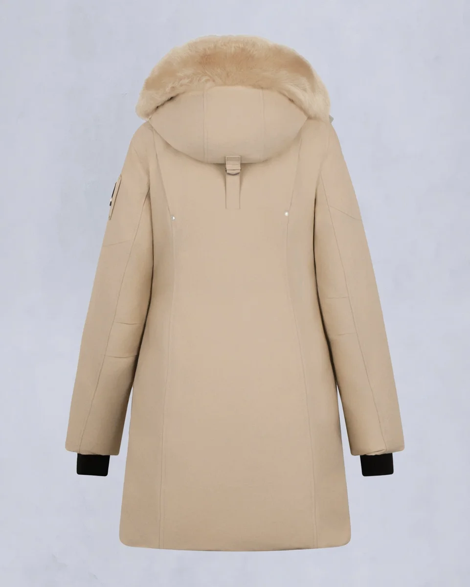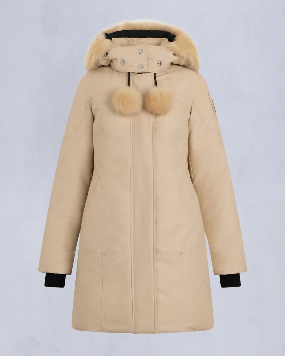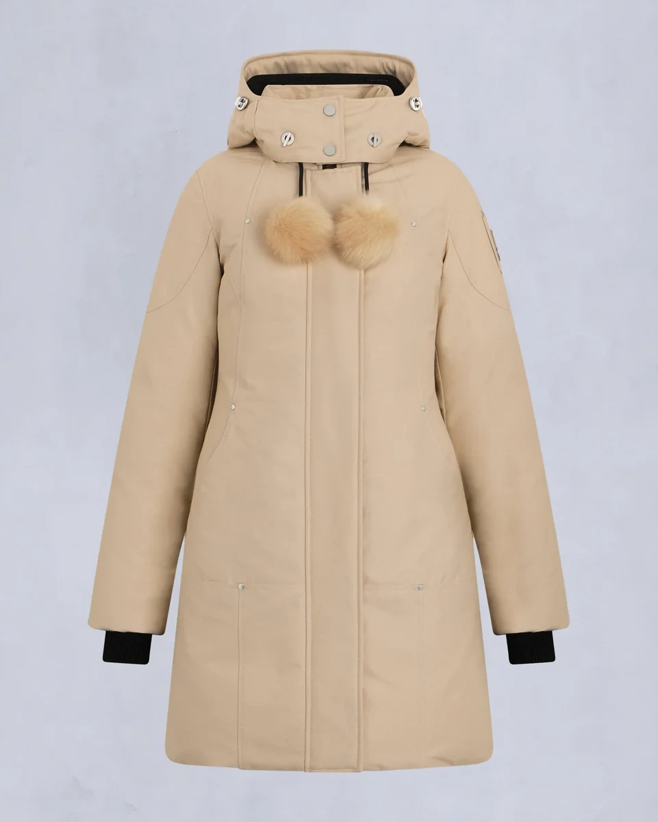 - Cappuccio rimovibile con bordo in shearling e pompon rimovibili