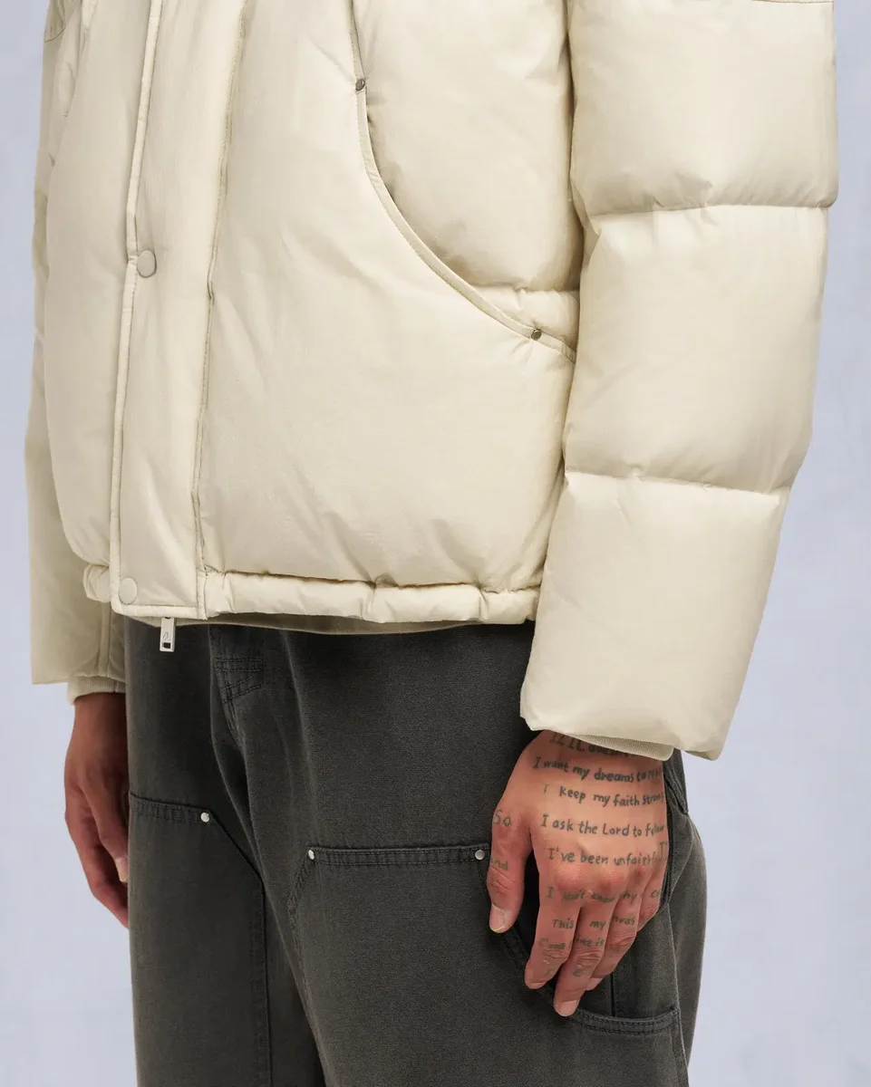 Un classico piumino reinventato con tecnologia e maestria artigianale moderne. Con una potente imbottitura in piuma d’anatra 90/10, un collo foderato in sherpa e un resistente rivestimento esterno, l’Everes